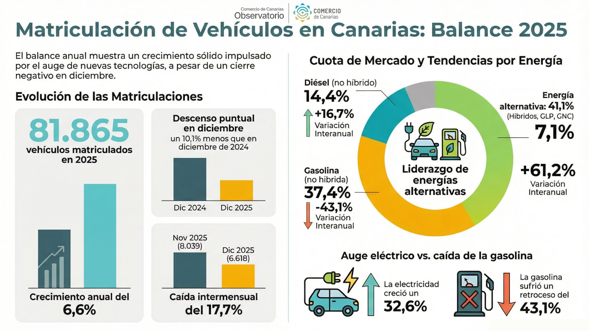 Durante el mes de diciembre de 2025, se han matriculado un total de 6.618 vehículos en Canarias. Esta cifra ofrece una doble lectura al analizar su evolución: