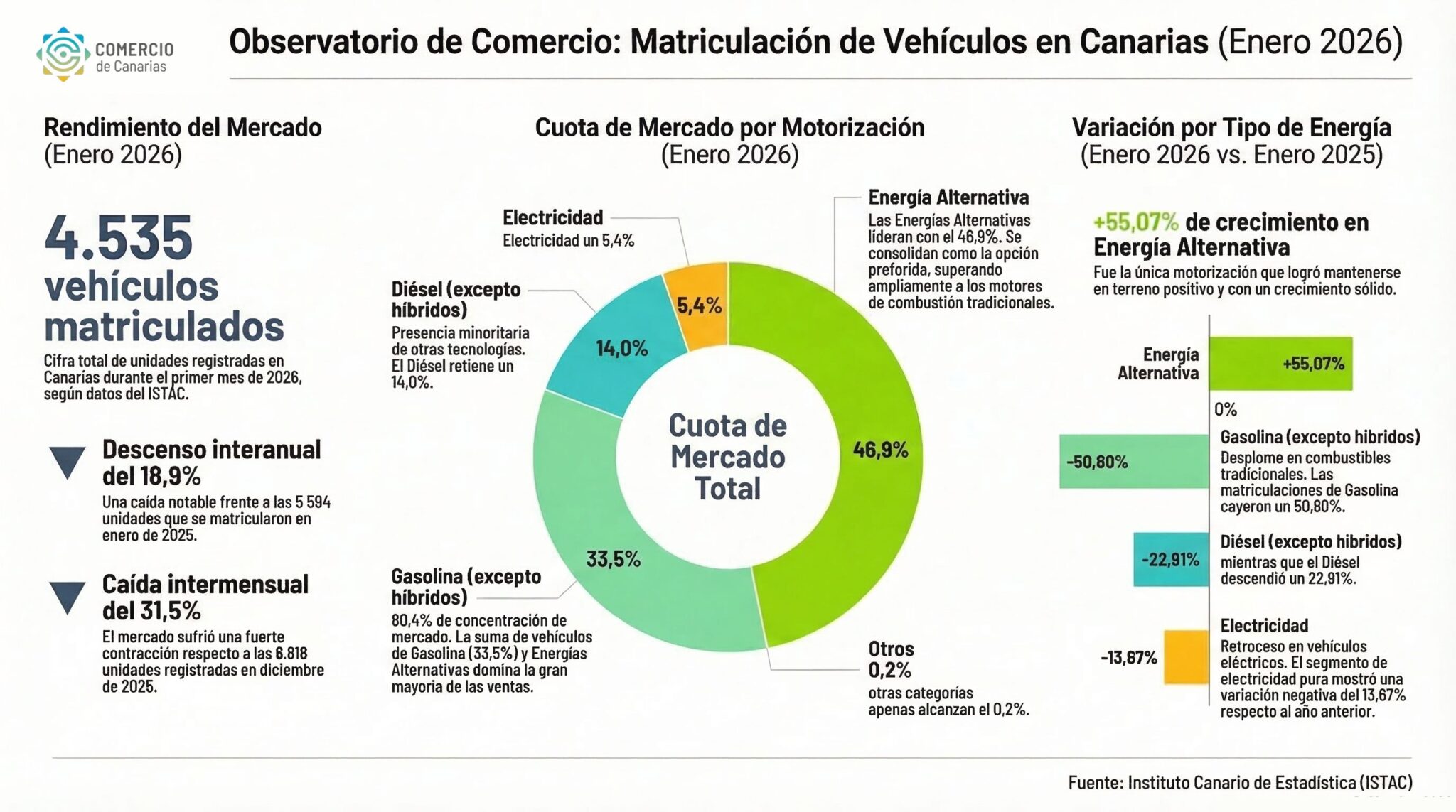 Durante el mes de enero de 2026, se han matriculado un total de 4.535 vehículos en Canarias. Esta cifra ofrece una doble lectura al analizar su evolución: