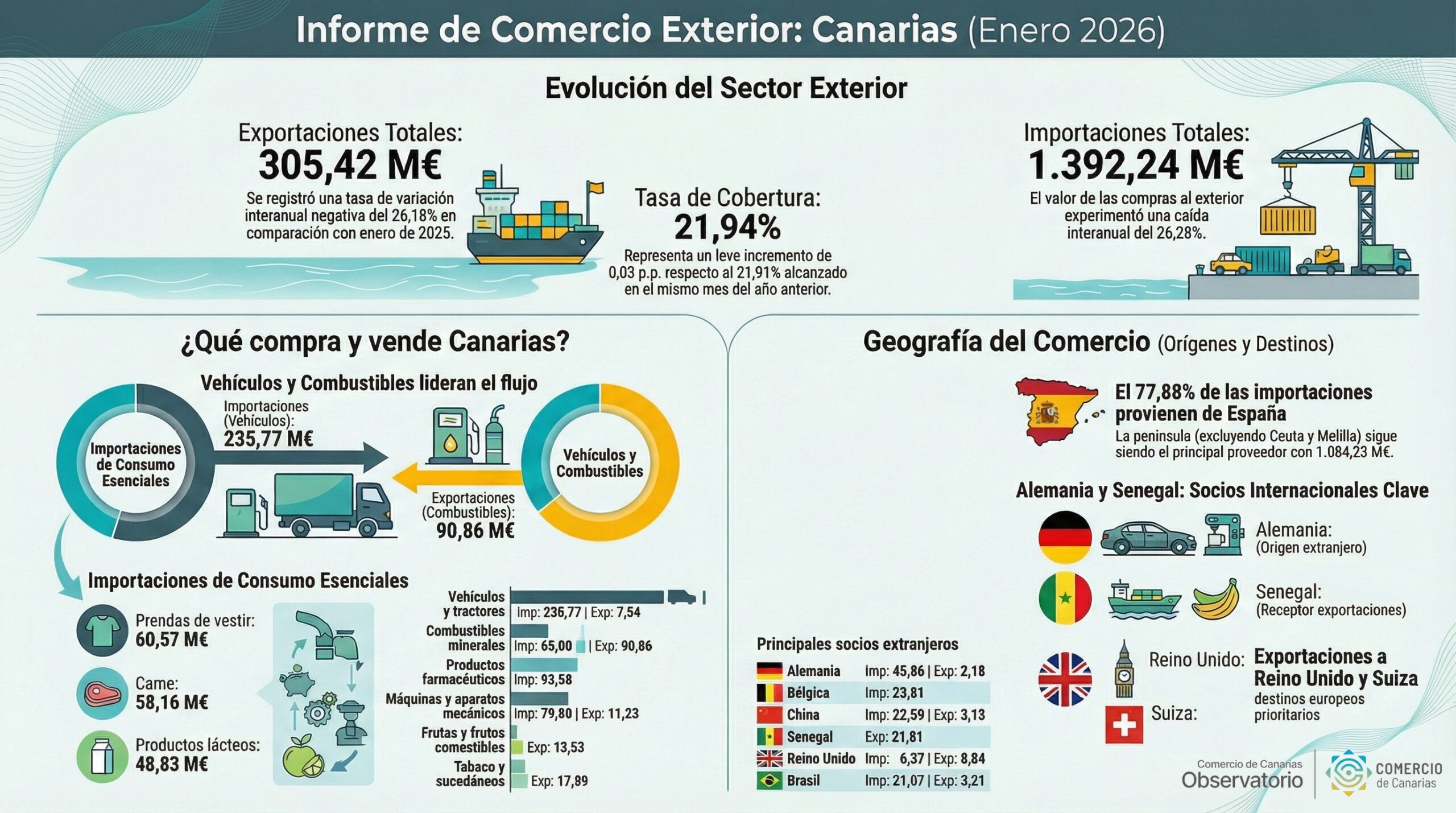 El Observatorio de Comercio de Canarias publica los resultados del comercio exterior del archipiélago correspondientes al mes de enero de 2026.