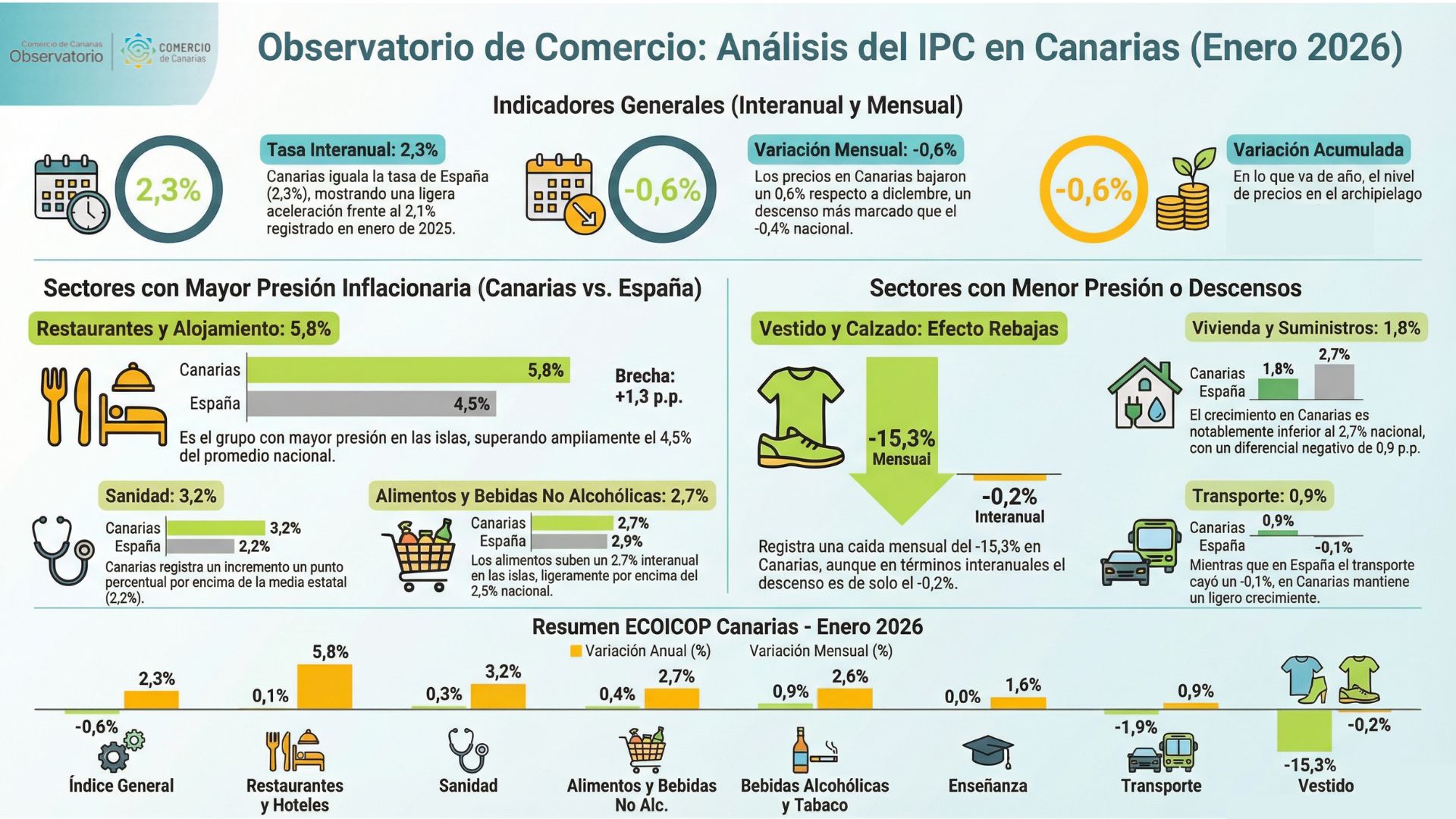 En enero de 2026, el Índice de Precios de Consumo (IPC) en Canarias registró una tasa interanual del 2,3%, en línea con la observada en el conjunto de España (2,3%).