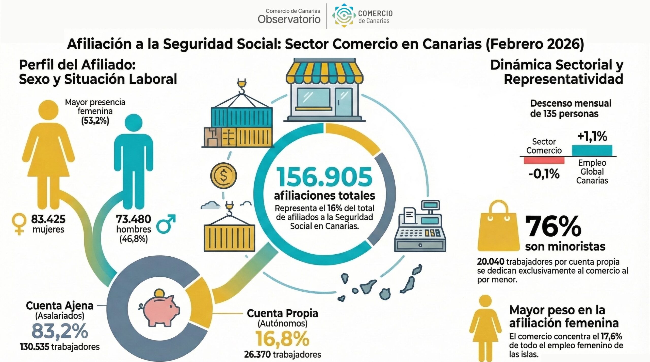 El comercio concentra el 16,0% de todas las afiliaciones de Canarias (156.905 de un total de 978.780). Desagregado por sexo, representa el 17,6% de la afiliación femenina (83.425 de 472.790 afiliadas) y el 14,5% de la masculina (73.480 de 505.985 afiliados). En términos de evolución de la representatividad del sector del comercio sobre el total del empleo en Canarias, la misma disminuyó 0,2 p.p. respecto al mes anterior. Por otro lado, la afiliación en el comercio cayó mensualmente un 0,1% en febrero, mientras que el total en Canarias creció un 1,1% (978.780 afiliados en febrero de 2026 frente a 968.505 en enero de 2026).