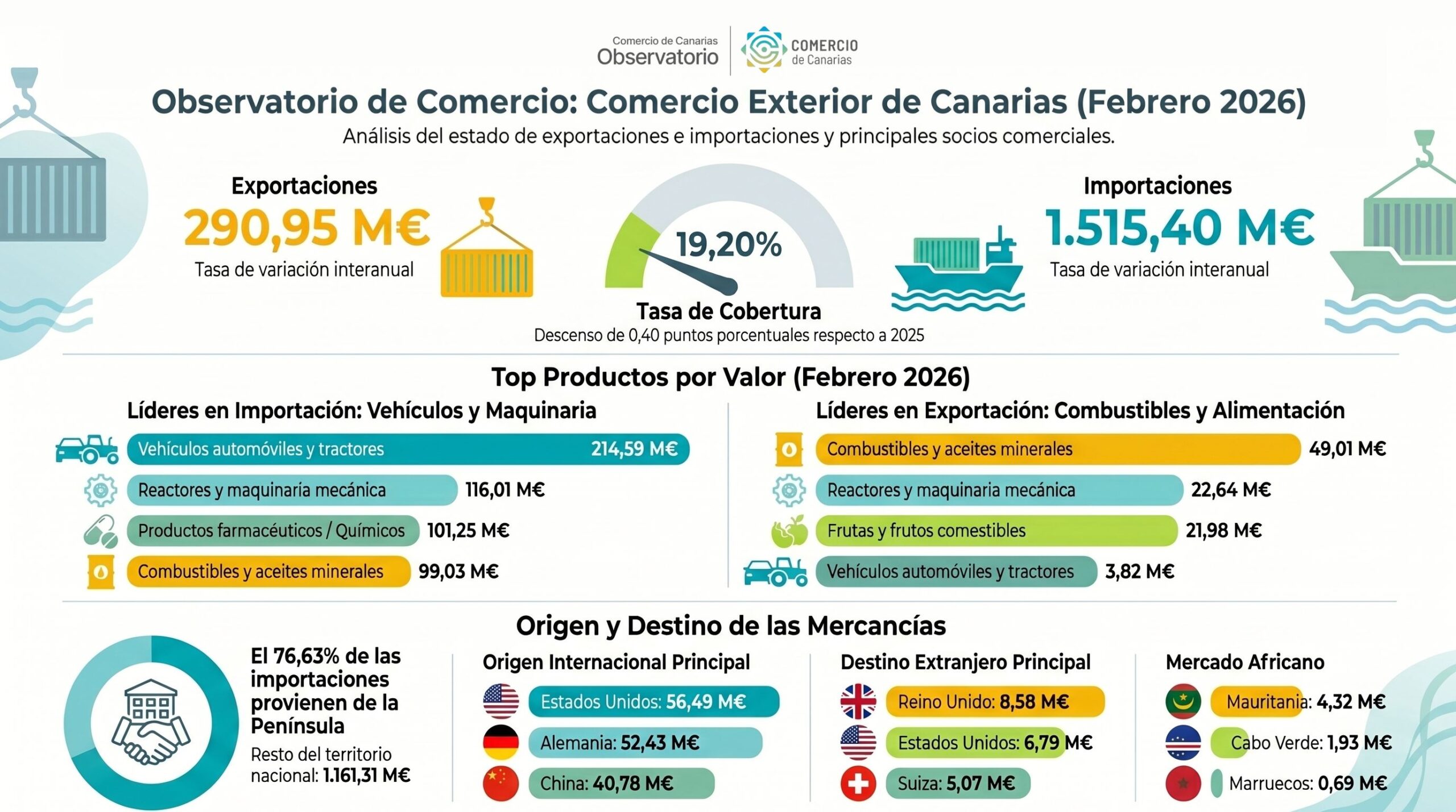 El Observatorio de Comercio de Canarias publica los resultados del comercio exterior del archipiélago correspondientes al mes de febrero de 2026.