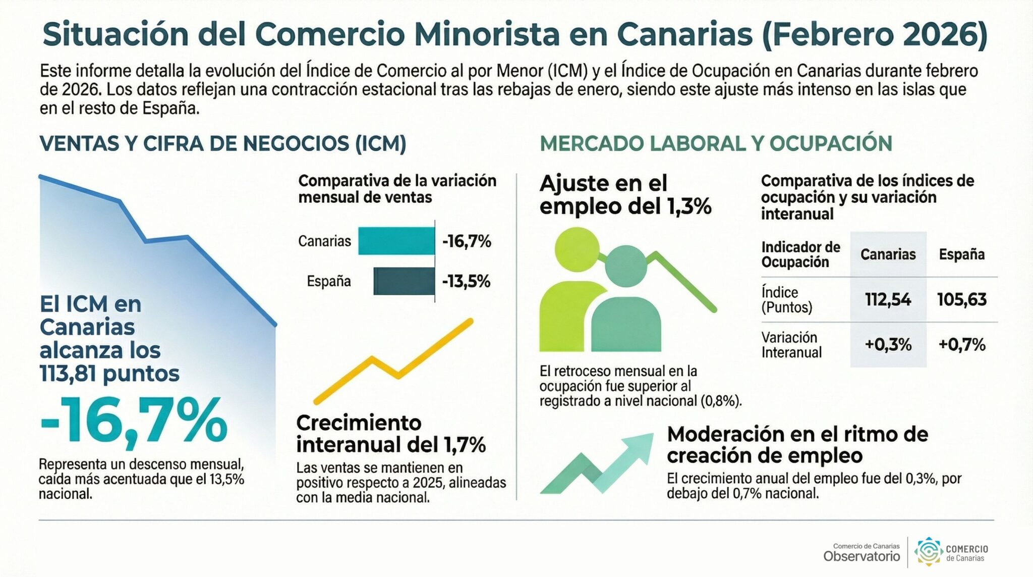 El Observatorio de Comercio de Canarias informa de la evolución del comercio minorista en el archipiélago durante el mes de febrero de 2026.