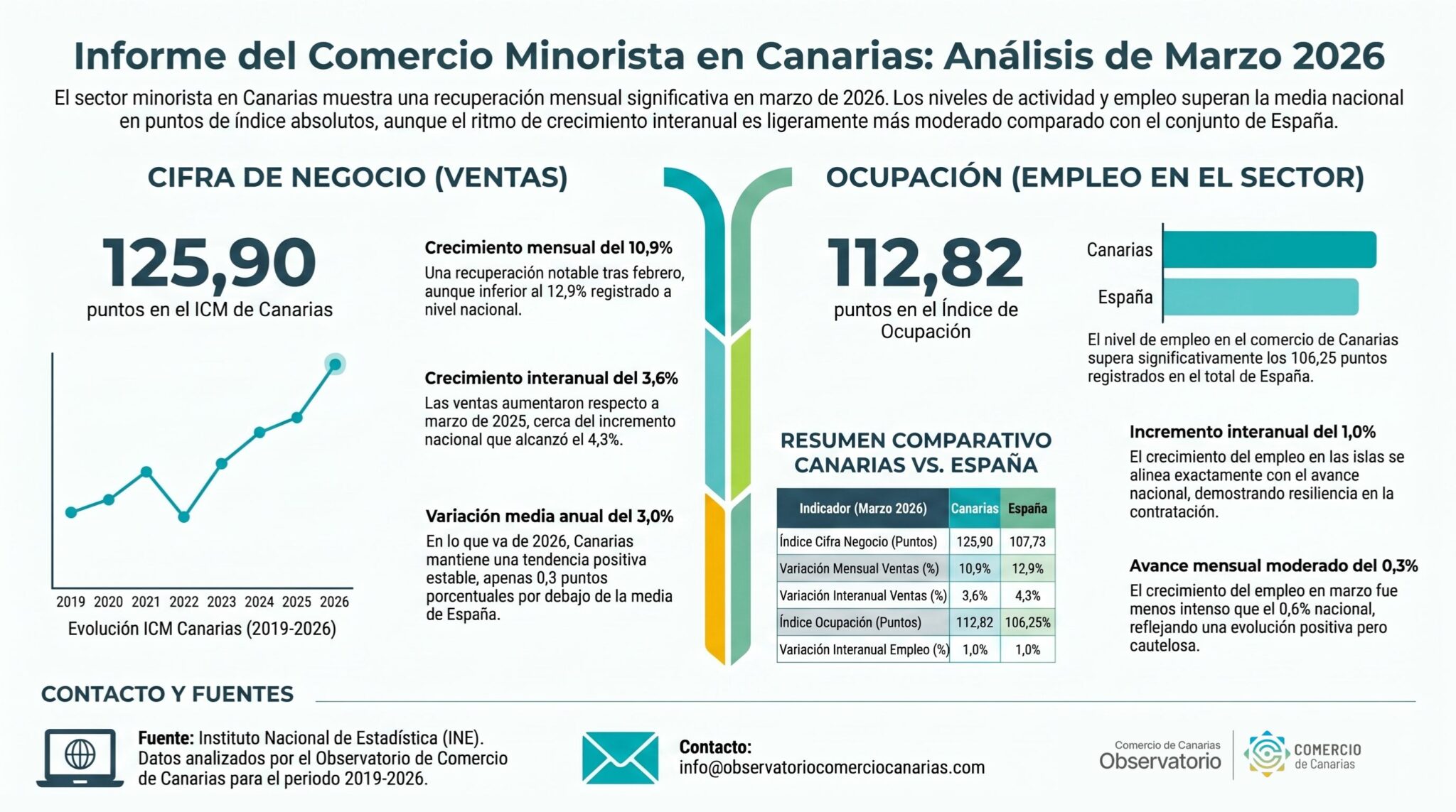 El Índice de Cifra de Negocios del comercio minorista (ICM) en Canarias se situó en 125,90 puntos en marzo de 2026, lo que supone un crecimiento mensual del 10,9%. Este avance fue inferior al registrado en el conjunto de España, donde el índice alcanzó los 107,73 puntos, con un incremento mensual del 12,9%.