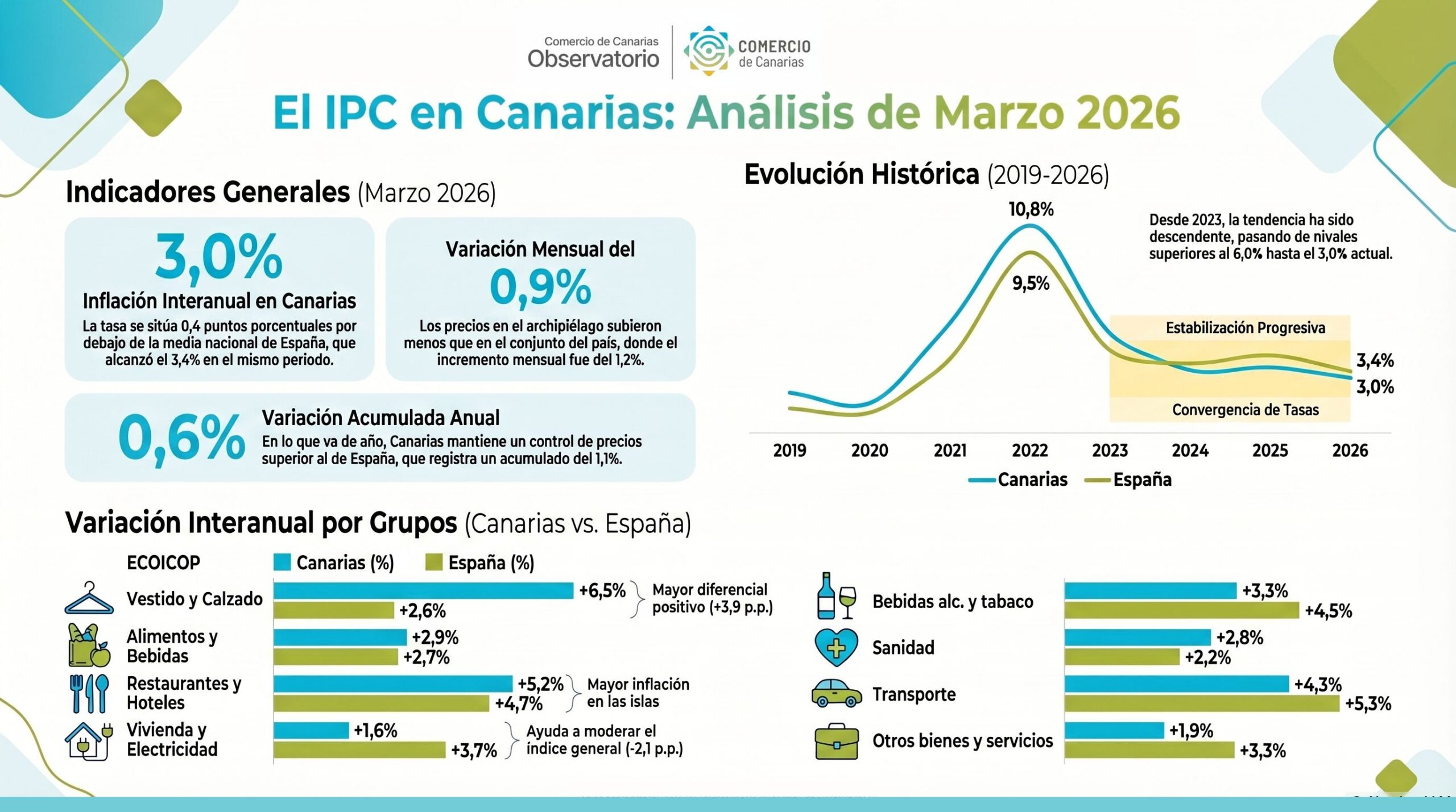 En marzo de 2026, el Índice de Precios de Consumo (IPC) en Canarias registró una tasa interanual del 3,0%, situándose por debajo de la observada en el conjunto de España (3,4%).